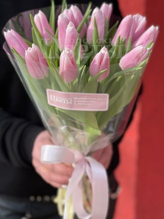 Букет из 15 розовых тюльпанов в пленку 3750 Оформить заказ Размер: высота ~50 см Состав: тюльпаны розовые, 15 шт. пленка флористическая лента атласная Размер: высота ~50 см Состав: тюльпаны розовые, 15 шт. пленка флористическая лента атласная С букетом можно подарить:Конфеты "Rafaello"800 ₽ Конфеты "Ferrero Rocher"1 200 ₽