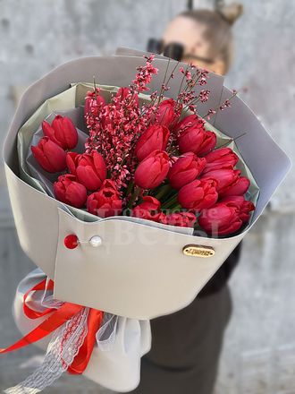 Букет из 25 красных тюльпанов с генистой 7250 Оформить заказ Размер: высота ~50 см Состав: тюльпаны красные, 25 шт. гениста упаковка - фоамиран лента атласная лента-кружево Размер: высота ~50 см Состав: тюльпаны красные, 25 шт. гениста упаковка - фоамиран лента атласная лента-кружево С букетом можно подарить:Конфеты "Ferrero Rocher"1 200 ₽ Конфеты "Rafaello"800 ₽