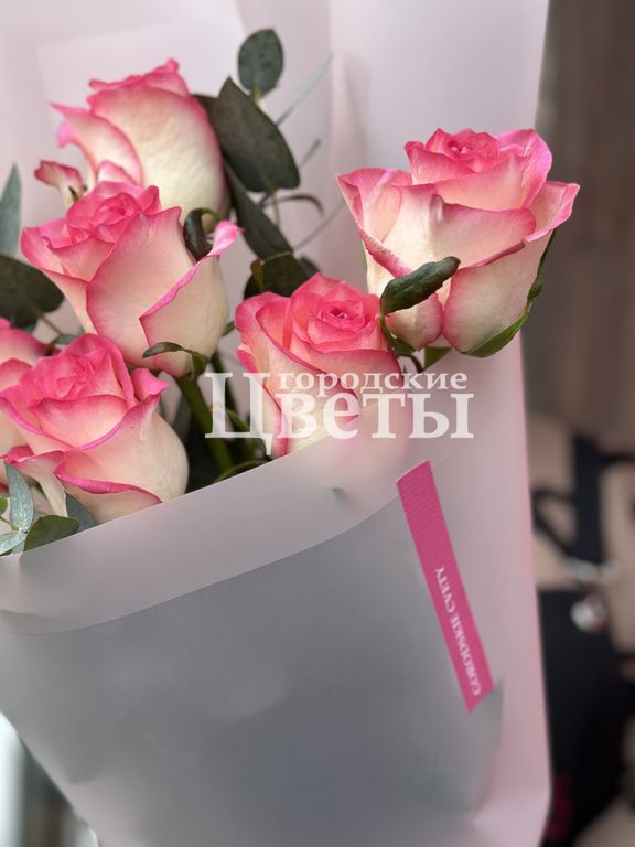 Букет из 7 роз "Джумилия" с эвкалиптом 3800 Оформить заказ Размер: высота ~60 см Состав: розы розовые, 7 шт. эвкалипт, 2 шт. пленка (Корея) лента атласная Размер: высота ~60 см Состав: розы розовые, 7 шт. эвкалипт, 2 шт. пленка (Корея) лента атласная С букетом можно подарить:Конфеты "Rafaello"800 ₽ 7 золотых шаров2 450 ₽ Мишка "Томми"1 200 ₽ Конфеты "Ferrero Rocher"1 200 ₽