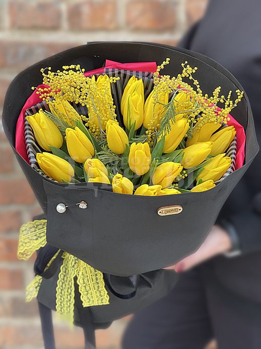 Яркий букет из 25 желтых тюльпанов с добавлением итальянской мимозы, в специальном флористическом фоамиране темного цвета, идеально подчеркивающем гамму букета и оформлением декоративной упаковочной бумагой двух оттенков.