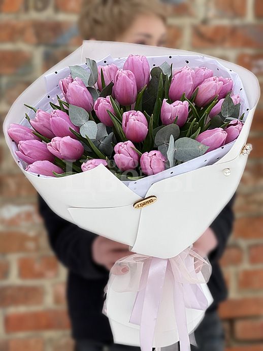 Яркий букет из 25 сиреневых тюльпанов, в специальном флористическом фоамиране, красного цвета, идеально подчеркивающем гамму букета.
