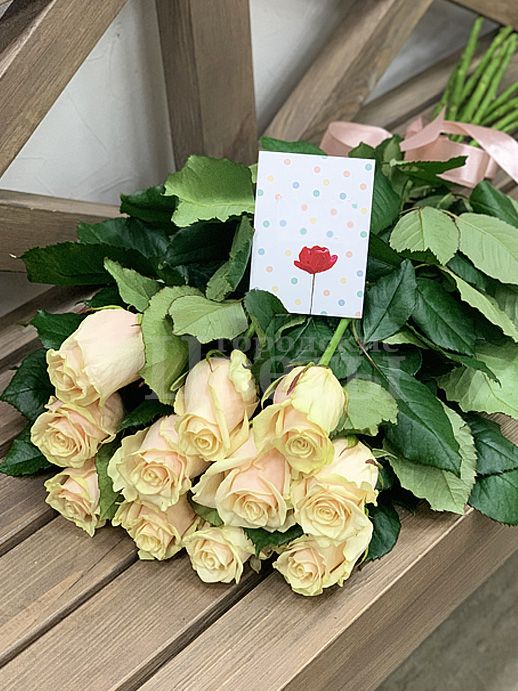 11 кремовых роз под ленту 3950 Оформить заказ Размер: высота роз ~60-70 см Состав: розы сорта Талеа, 11 шт. лента атласная открытка (при необходимости) *дизайн открытки к букету может отличаться от представленной на фото Размер: высота роз ~60-70 см Состав: розы сорта Талеа, 11 шт. лента атласная открытка (при необходимости) *дизайн открытки к букету может отличаться от представленной на фото С букетом можно подарить:Мишка "Веня"1 200 ₽ Конфеты "Rafaello"800 ₽ Мишка "Джонни"2 300 ₽ Конфеты "Ferrero Rocher"1 200 ₽