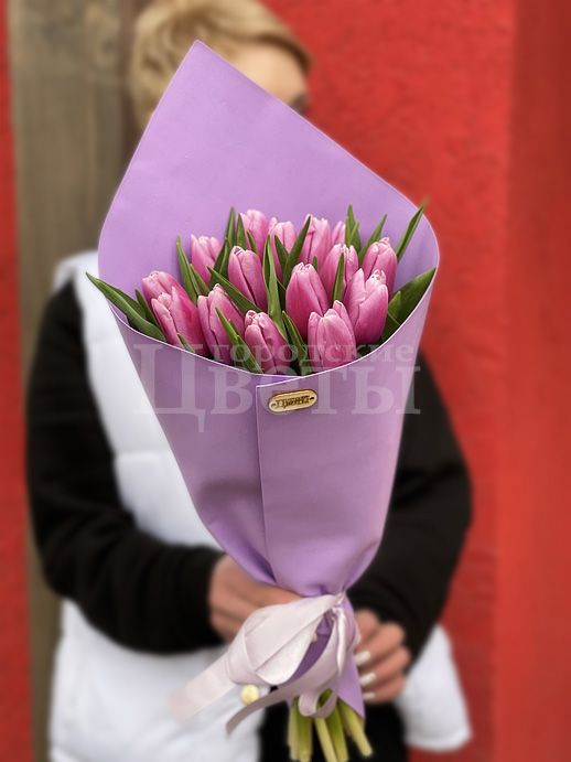 Букет из 15 сиреневых тюльпанов 3950 Оформить заказ Размер: высота ~50 см Состав: тюльпаны сиреневые, 15 шт. фоамиран лента атласная Размер: высота ~50 см Состав: тюльпаны сиреневые, 15 шт. фоамиран лента атласная