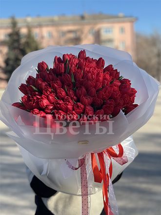 Букет из 101 красного тюльпана 24900 Оформить заказ Размер: высота ~50 см Состав: тюльпаны красные, 101 шт. пленка полуматовая (Корея) лента атласная Размер: высота ~50 см Состав: тюльпаны красные, 101 шт. пленка полуматовая (Корея) лента атласная С букетом можно подарить:Конфеты "Rafaello"800 ₽ Мишка "Томми"1 200 ₽ Конфеты "Ferrero Rocher"1 200 ₽ Мишка "Джонни"2 300 ₽