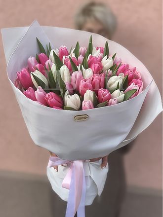 Букет из 55 белых и розовых тюльпанов 13950 Оформить заказ Яркий весенний букет из 55 тюльпанов, созданный специально, чтобы подарить позитивное настроение и радостные эмоции в праздничный день! Размер: высота ~50 см Состав: тюльпаны, 55 шт. фоамиран лента атласная Яркий весенний букет из 55 тюльпанов, созданный специально, чтобы подарить позитивное настроение и радостные эмоции в праздничный день! Размер: высота ~50 см Состав: тюльпаны, 55 шт. фоамиран лента атласная С букетом можно подарить:Конфеты "Rafaello"800 ₽ Мишка "Генри"4 100 ₽